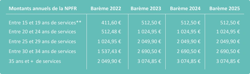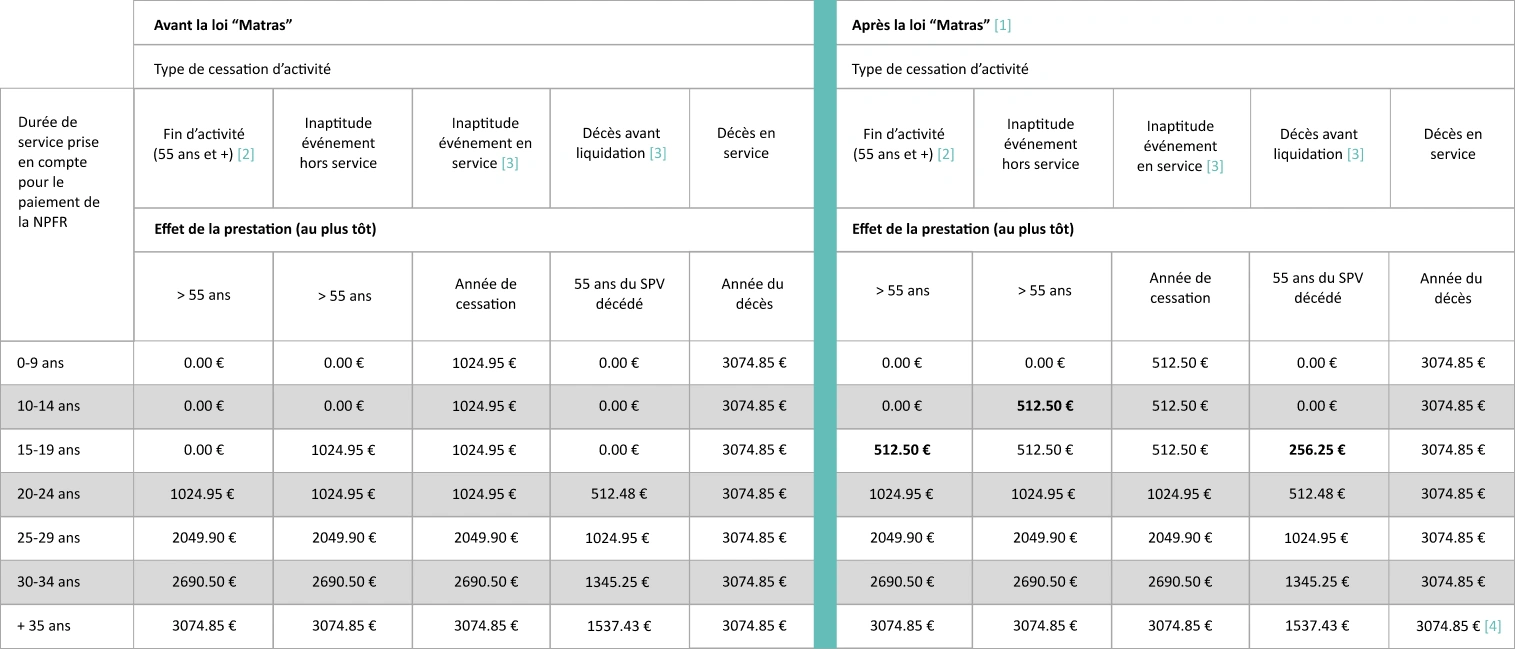 Remarque loi Matras : Un SPV cessant son activité sur le seuil des « 15 ans de service » verra l’intégralité de sa prestation versée via la NPFR ( SPV non éligible à l’Allocation de Fidélité ainsi qu’à la PFR1).